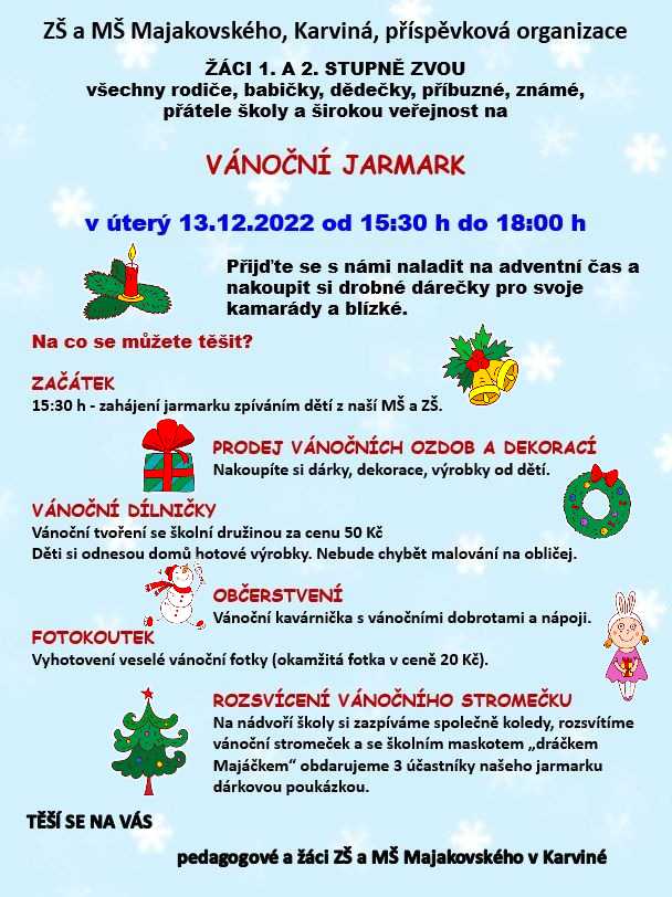 Vystoupení dětí: sraz polodenních dětí 13.12.2022 u hlavního vchodu ZŠ v 15:15 hod., s ostatními dorazí paní učitelky, Prosíme v tento den o bílo-červené oblečení pro děti. Vše potřebné naleznete na níže přiloženém plakátu. Děkujeme a budeme se těšit na vánoční atmosféru😘