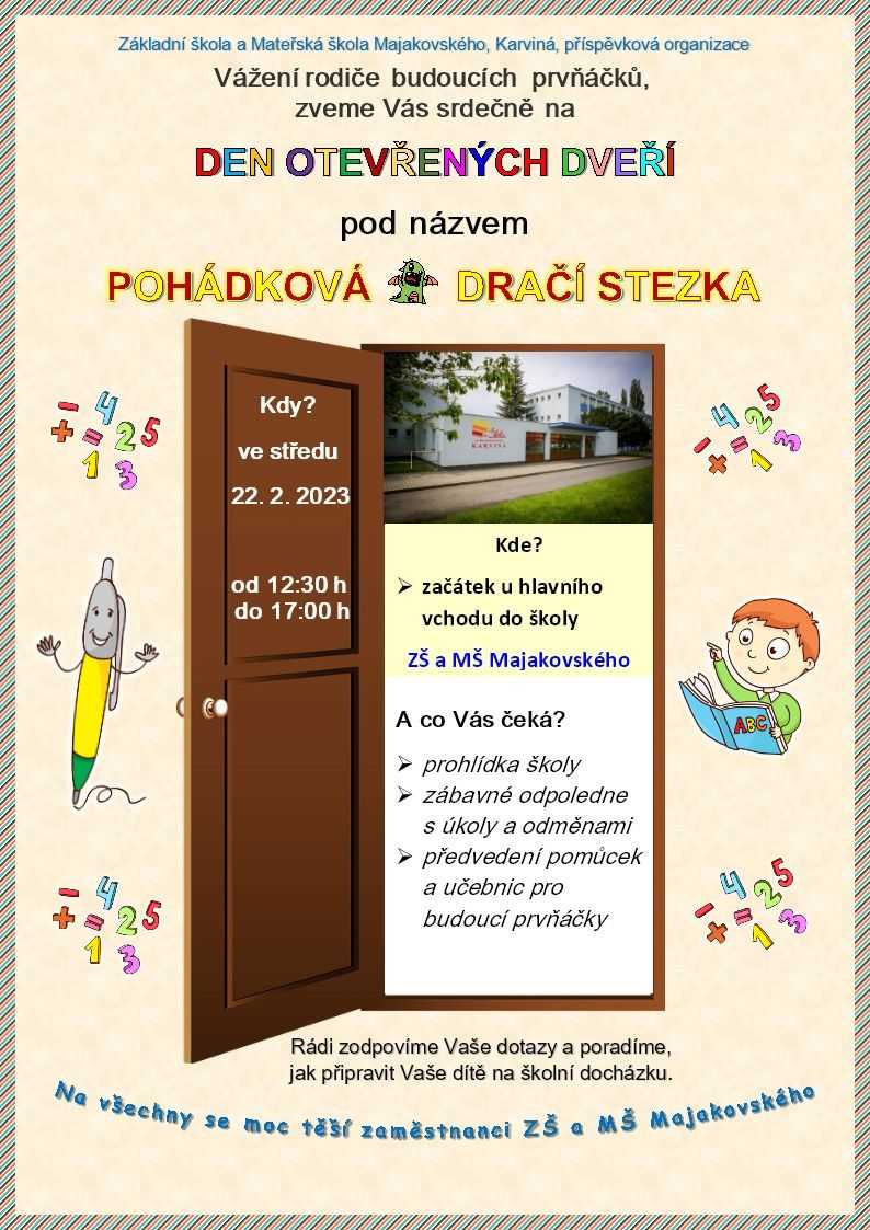 Naše ZŠ zve všechny předškoláky s rodiči na "Den otevřených dveří" ve středu 22.2.2023. Bližší informace na přiloženém plakátku 😉