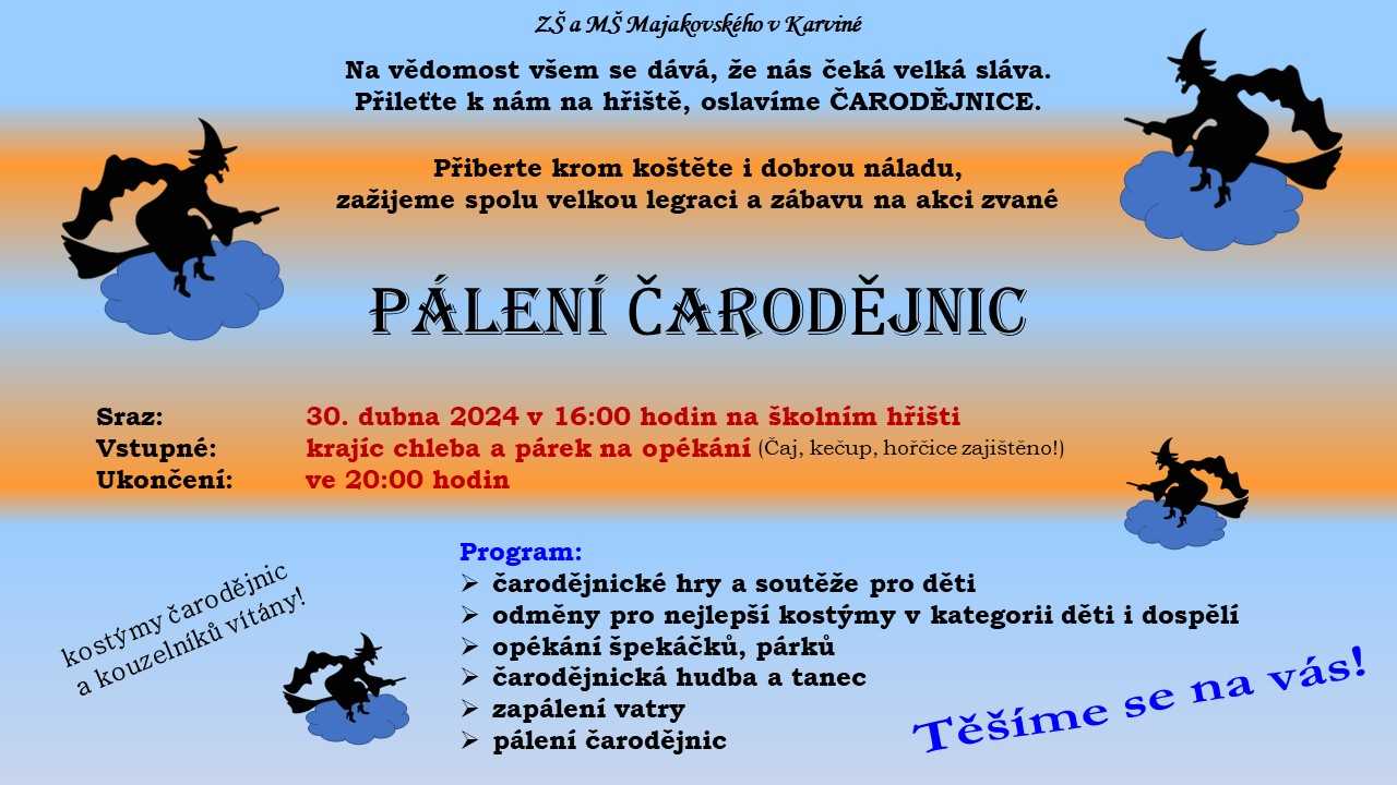 V úterý 30.4.2024 oslavíme s dětmi čarodějnický den. Nejdříve nás čeká tematické dopoledne v kostýmech v naší školičce. Po odpolední svačince se přesuneme do areálu ZŠ Majakovského, kde vyvrcholí naše oslavy čarodějnic.