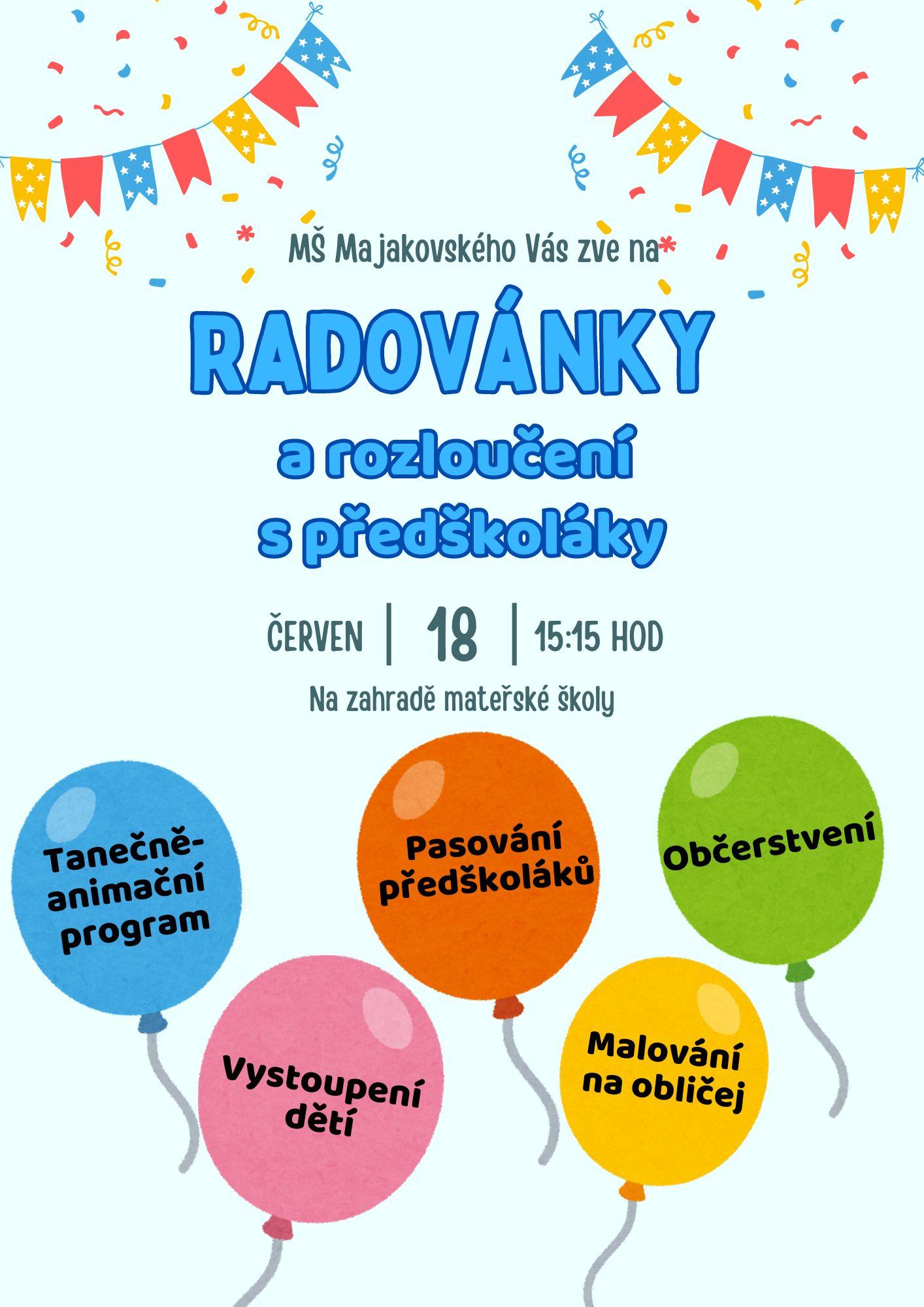 Kamarádi, přijďte společně s námi již tradičně oslavit Radovánky a rozloučit se s našimi předškoláky, kterým se čas strávený v naší školičce pomalu - ale jistě - krátí. Můžete se těšit na bohatý program a nebude chybět ani vystoupení dětí!