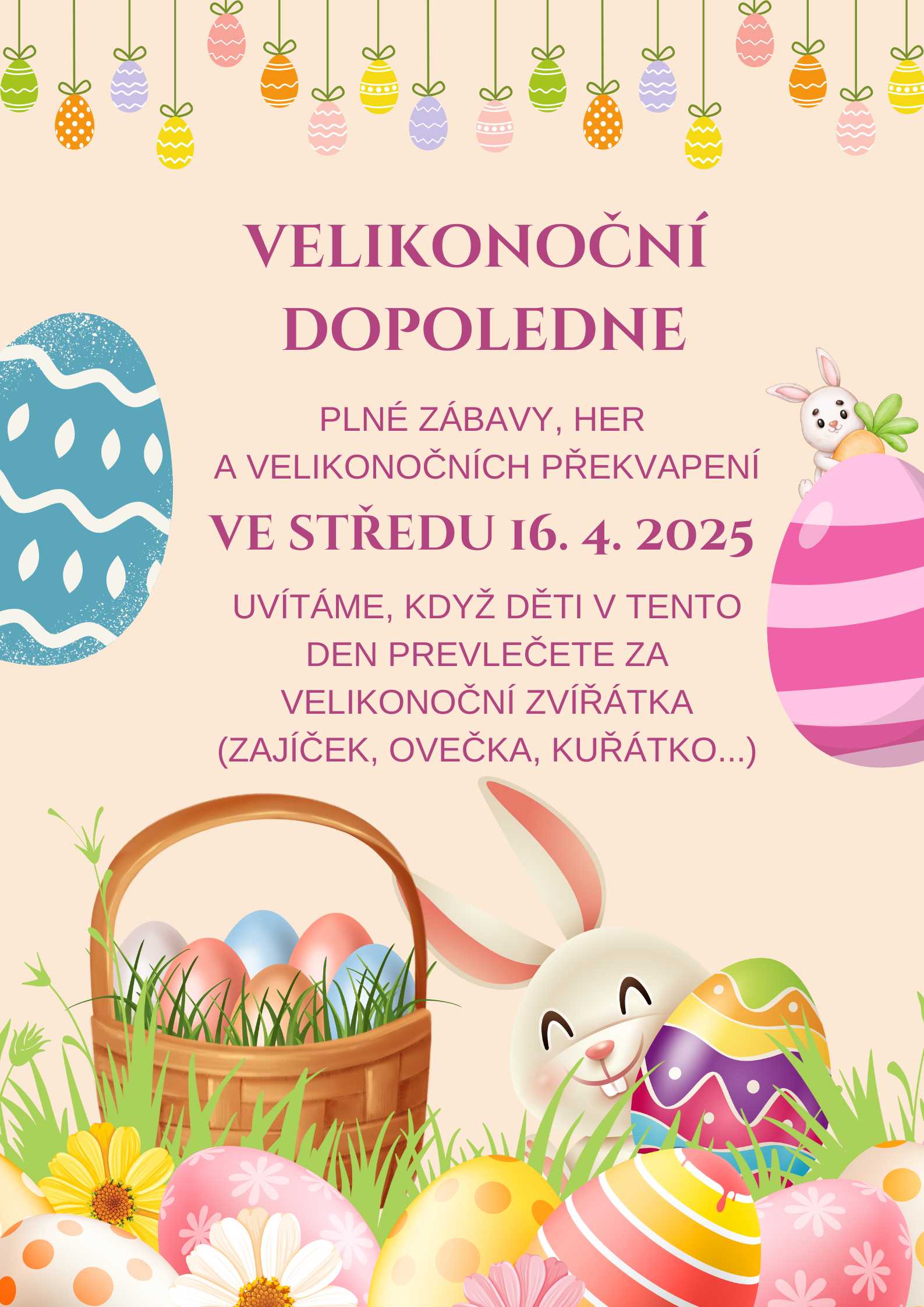 Ve středu 16. 4. 2025 máme ve školce VELIKONOČNÍ dopoledne.