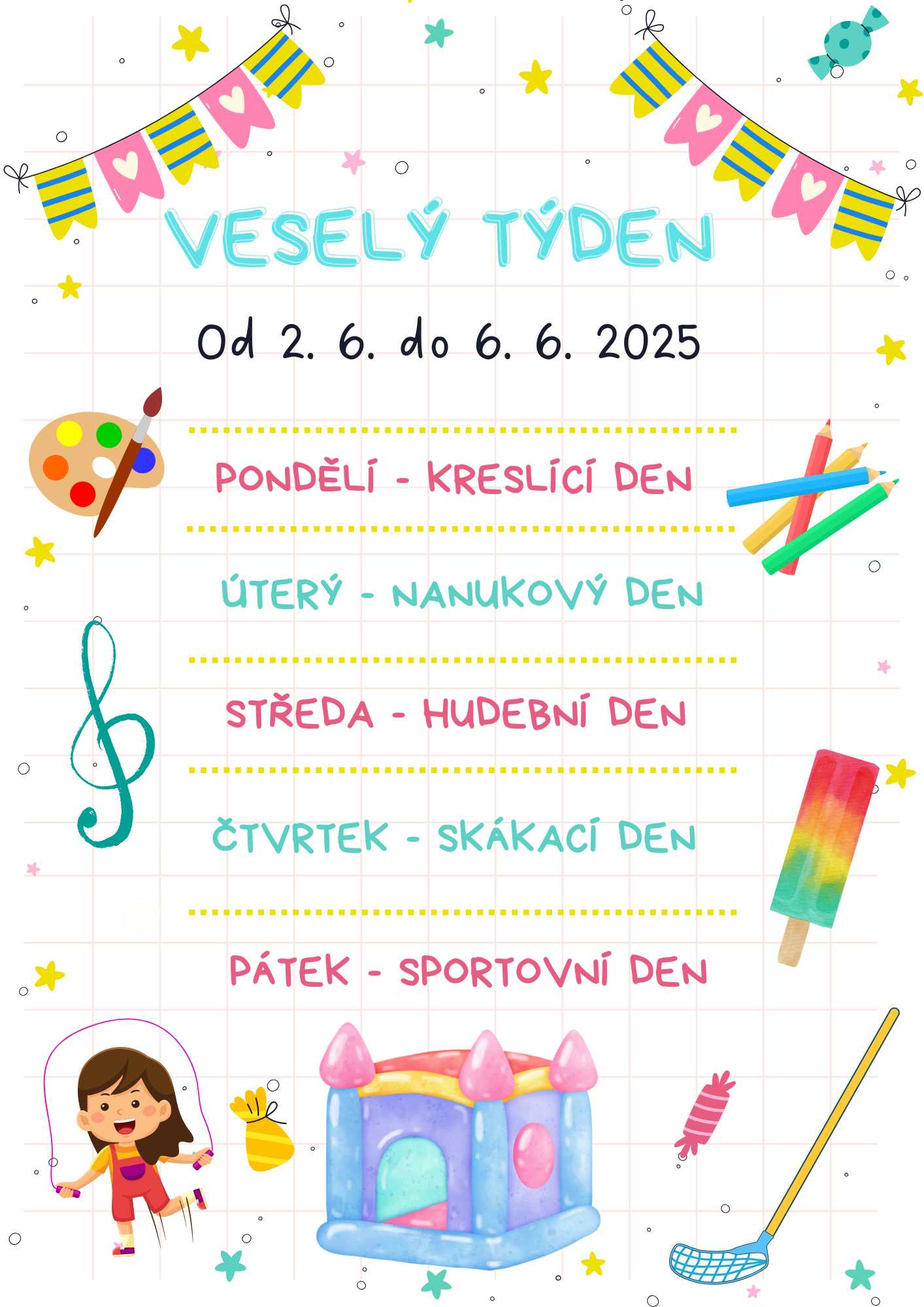 Od 2. 6. do 6. 6. 2025 nás čeká VESELÝ TÝDEN plný zábavy her a překvapení, který bude věnován oslavě Dne dětí. Kždý den na ně čeká něco speciálního,