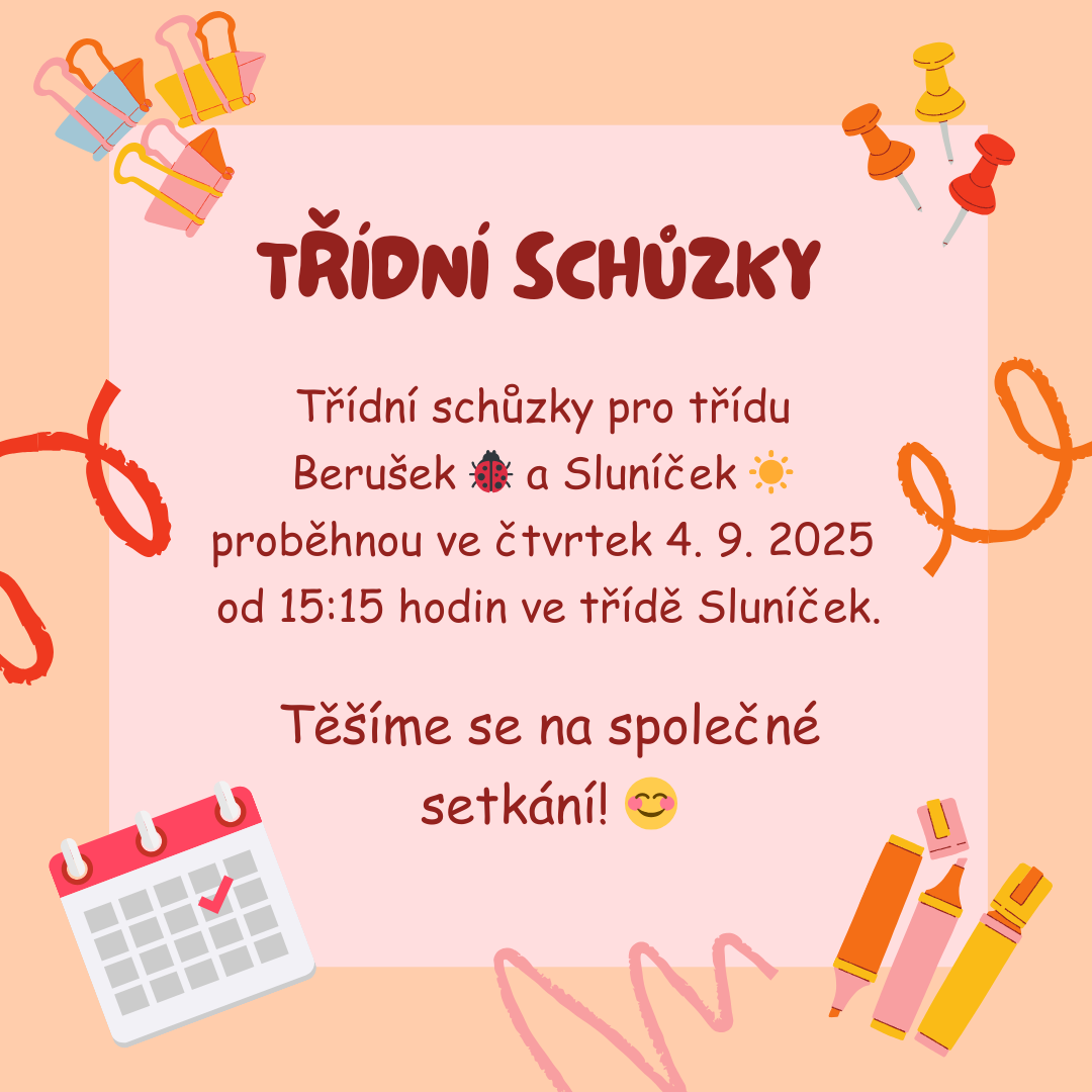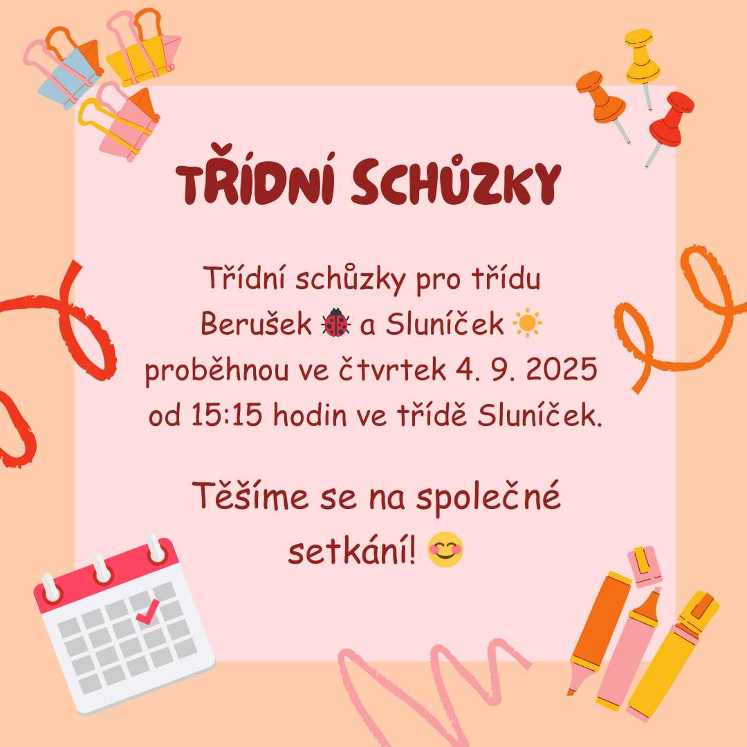 Ve čtvrtek 4. 9. 2025 proběhnou třídní schůzky třídy Sluníček a Berušek.