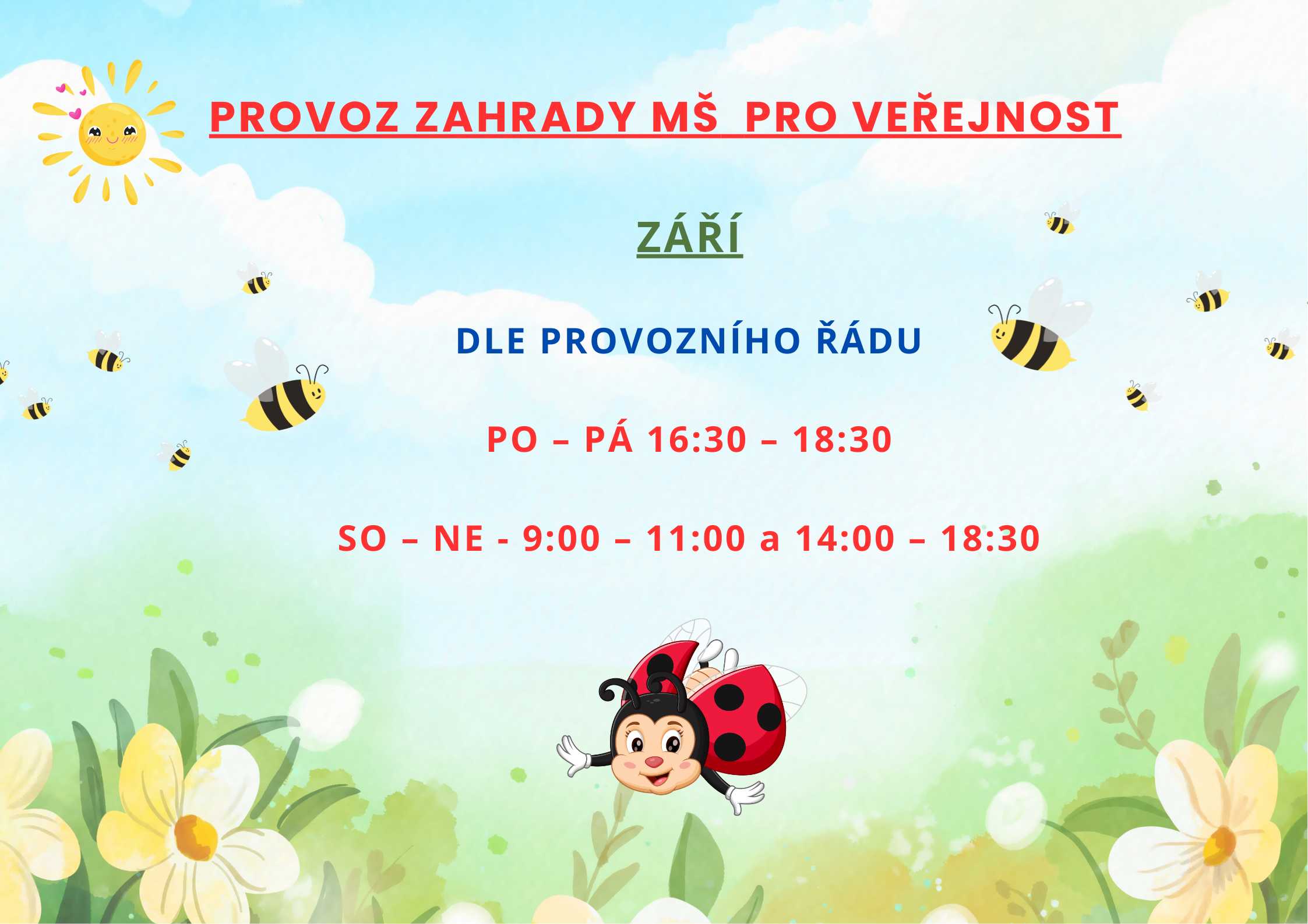 Zahrada pro veřejnot otevřena i v září. Provozní doba je platná pouze za příznivého počasí, které nebrání bezpečnému pobytu a využití herních prvků.