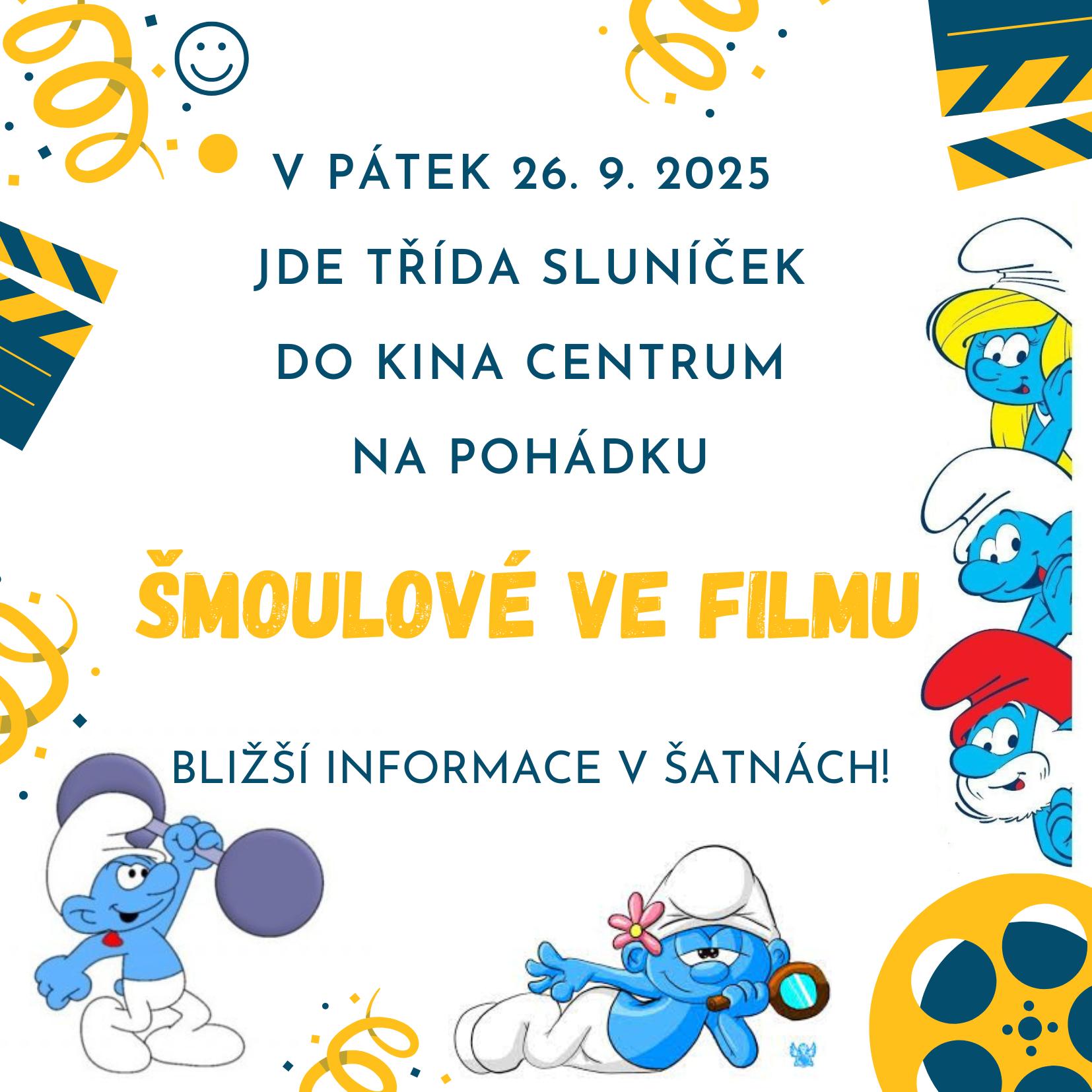 V pátek dne 26. 9. 2025 jdou děti ze třídy Sluníček do kina Centrum na pohádku "Šmoulové ve filmu".