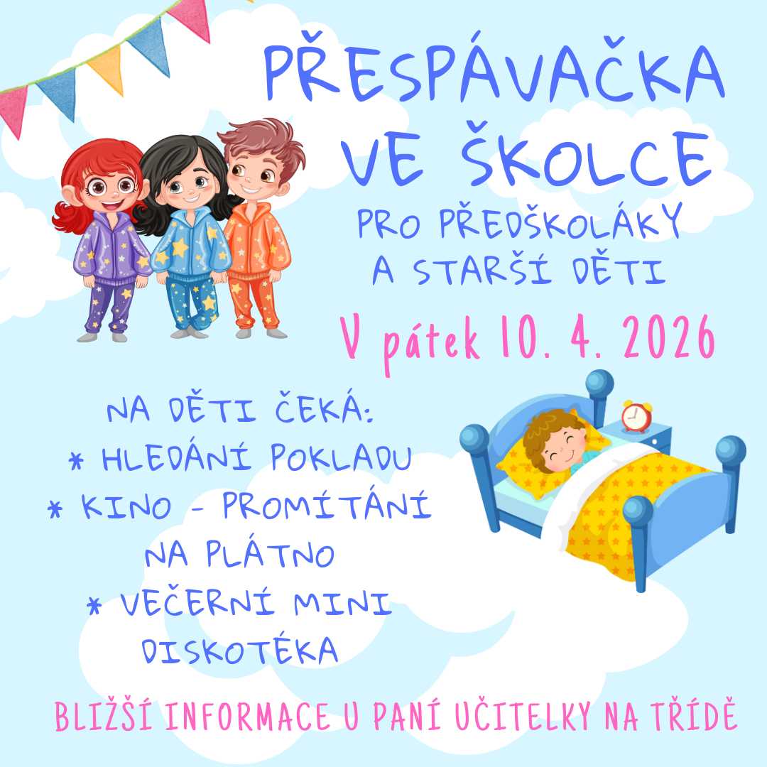V pátek 10. 4. 2026 se ve školce uskuteční přespávačka pro předškoláky a starší děti.